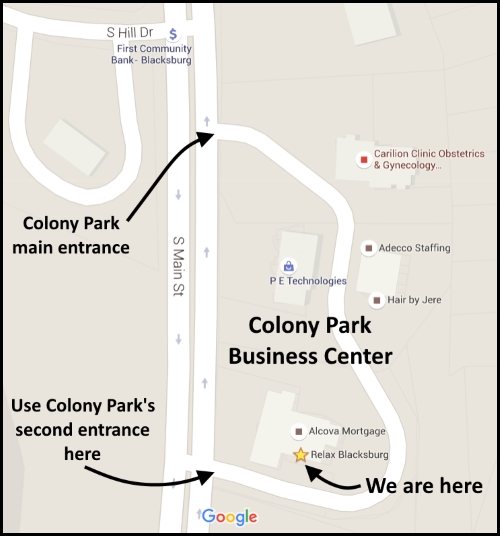 As you come into Blacksburg from Christiansburg, you will see Speedway gas station and then Highland Tree Care on the right-hand side of the road. Take the next right which is the south entrance into Colony Park. As you pull into the parking lot look left and you will see our sign above the 2001 on the building. Our entrance is directly below our sign.